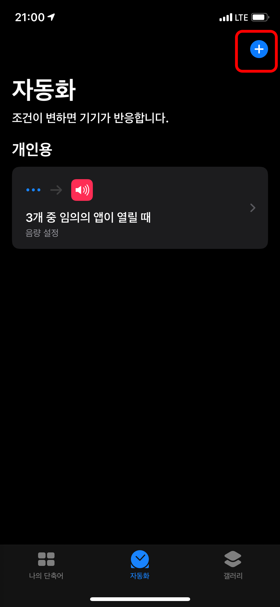 그런 다음 두 번째, 하단에 '자동화' 카테고리를 클릭해줍니다. 그런 다음 우측 상단에 '+'를 클릭해줍니다. +아이콘은 무엇인가를 추가한다는 의미겠죠~? 자동화는 조건이 변하면 기기가 반응을 하게 해주는 하나의 설정입니다. 그렇기에 오늘 저희가 원하는 것은 카메라를 실행시켰을 때, 소리가 안 나게끔 진행해줘!라는 것입니다.